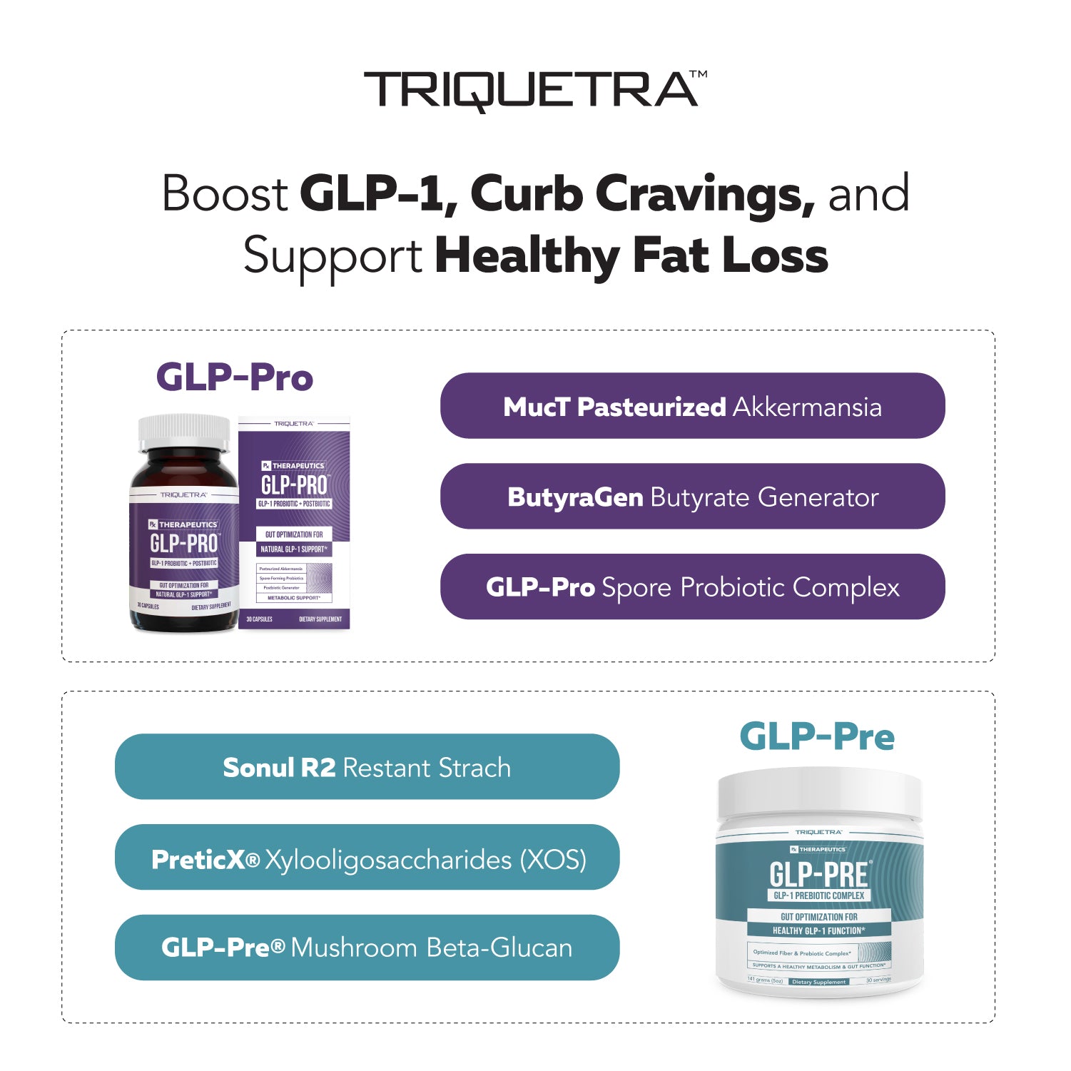 This product is intended for adults with a BMI over 27 who are searching for support in their weight loss journey. GLP-Pre + Pro complements GLP-1 based approaches to weight control.
